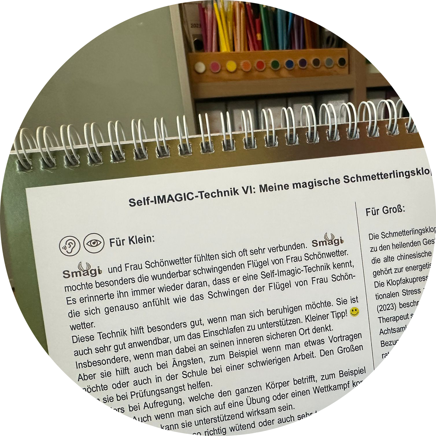Das Flipchartbuch vereint die wertvollsten Konstrukte, Prinzipien und Techniken der modernen Psychotherapie. Die Kinder (und auch Erwachsene) können sich mit Smagi und seinen Freunden identifizieren und erlernen gemeinsam spielerisch die magischen Zaubertricks durch (Vor-)Lesen, Mitmachen und Gestalten. Die imaginativen Strategien stärken die eigene emotionale Stabilisierung. Diese wertvollen, wissenschaftlich fundierten und leicht zu erlernenden Techniken sind in langjähriger therapeutischer Praxis angewandt.